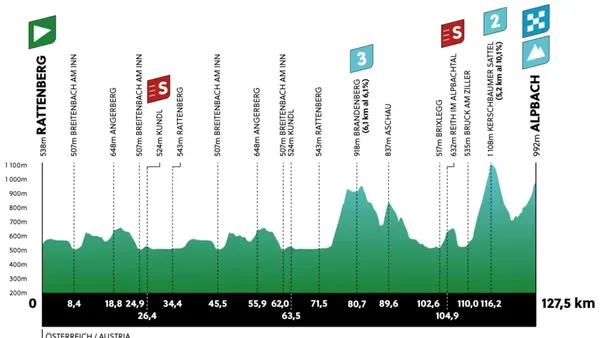 Après avoir atteint le sommet du Kerschbaumer Sattel, la route redescend vers Reith im Alpachtal. C’est là que commence la montée finale, longue de 6,2 kilomètres. La moyenne est de 4,8 %, mais tout se joue dans le dernier kilomètre, une section à près de 8 % avec une rampe à deux chiffres dans les 400 derniers mètres. La première étape de l’année dernière a été remportée par Geoffrey Bouchard. La victoire a été serrée, puisque le peloton a terminé 5 secondes plus tard derrière le coureur français.