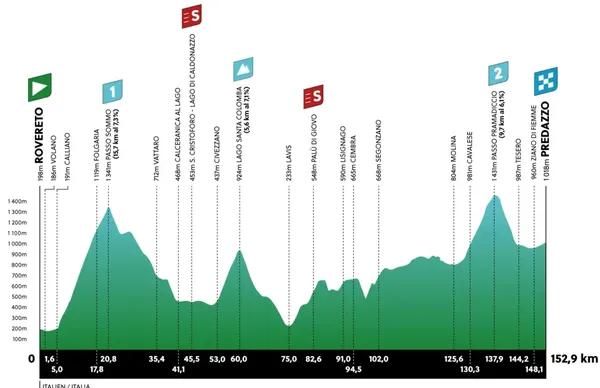 La montée vers le Lago di Cei s’étend sur 9,7 kilomètres et la pente moyenne est de 7,7 %. Mais comme les trois derniers kilomètres ressemblent davantage à un faux plat, le reste est beaucoup plus difficile que cette statistique ne le laisse supposer. Les troisième et quatrième kilomètres sont à deux chiffres. Après une descente rapide et 25 kilomètres de terrain pratiquement plat, les coureurs atteignent Avio. C’est là que commence la montée finale vers San Valentino di Brentonico. Il s’agit d’une montée régulière de 15,5 kilomètres avec une pente moyenne de 7,5 %.