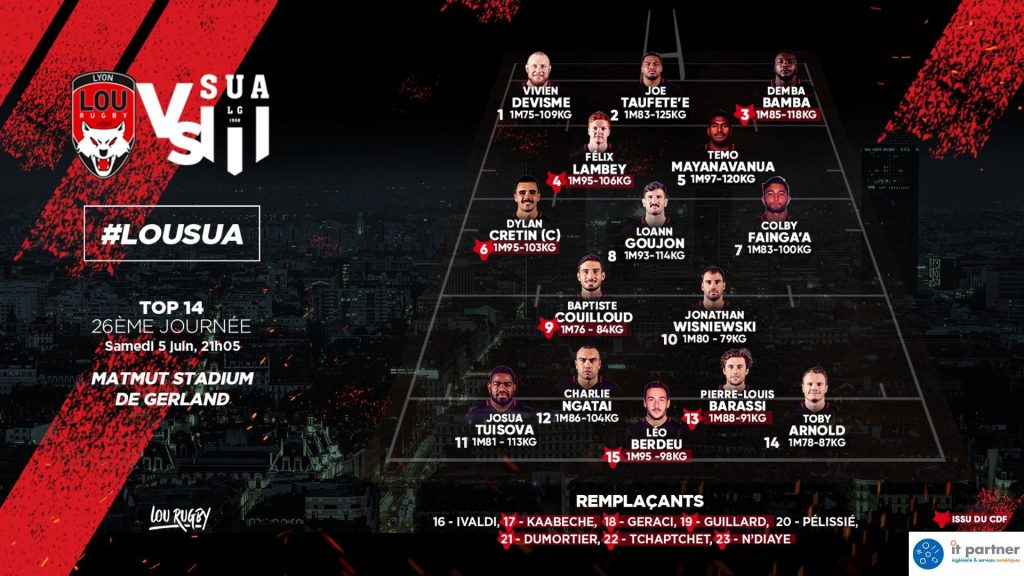 #LOUSUA I Le Capitaine Jean-Marcellin Buttin mènera cette équipe pour la dernière journée de @top14rugby !@LeLOURugby ⚔️ @agen_rugby , c'est demain 21h05 Matmut Stadium de Gerland ! 🔥 pic.twitter.com/t1wqSKGVpo