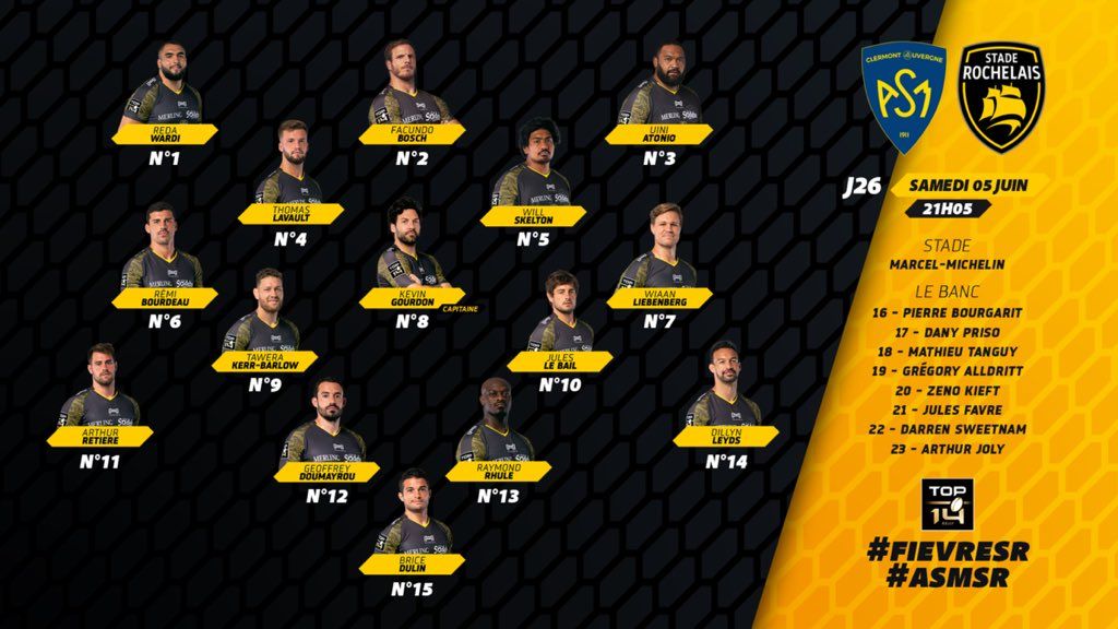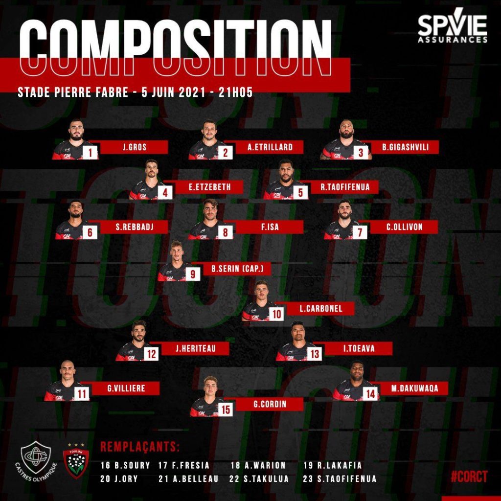 Voici la composition de votre équipe pour la dernière journée de TOP14 ce samedi à 21H05 face au Stade Français.#combat #attaque #défense #soutien #votresoutien , ces quelques mots ont dicté la semaine de travail de nos joueurs.
