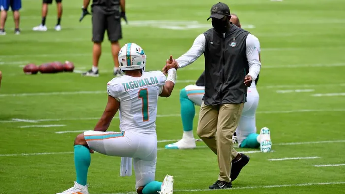 Le 5e choix de la Draft 2020 a disputé la semaine dernière son quatrième match en NFL. Chez des Dolphins en course pour les playoffs, l’ancien quarterback d’Alabama trouve peu à peu ses marques.