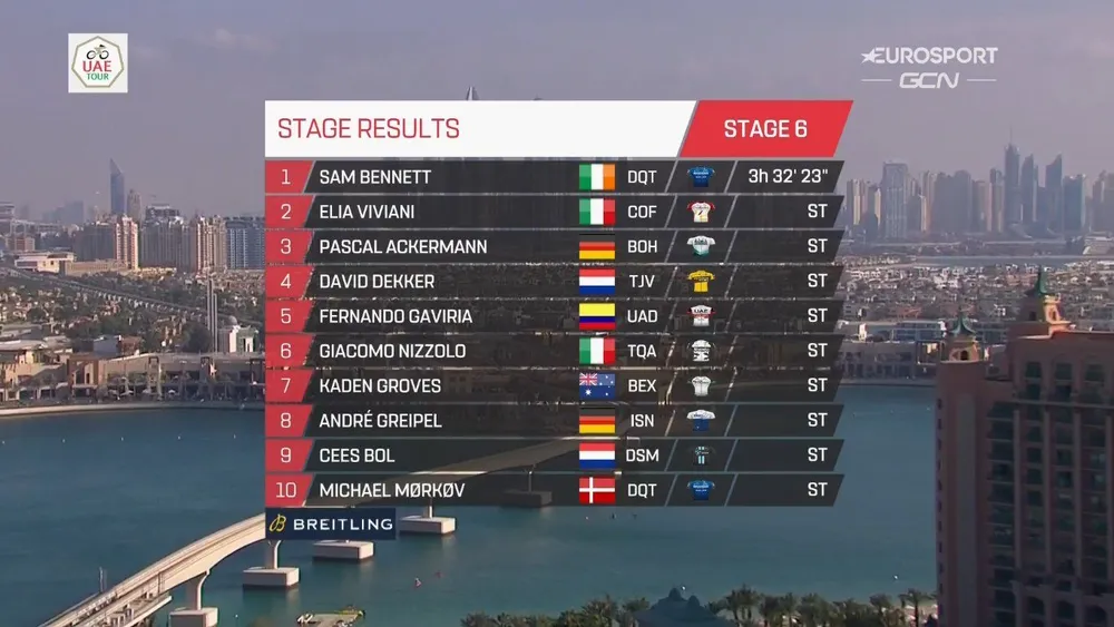 La 6e étape de l’UAE Tour est remportée par Sam Bennett au sprint. Il s’agit de la deuxième victoire de l’Irlandais dans cette édition après la victoire lors de la 4e étape. Tadej Pogačar conserve le maillot rouge de leader, en tête du classement général.