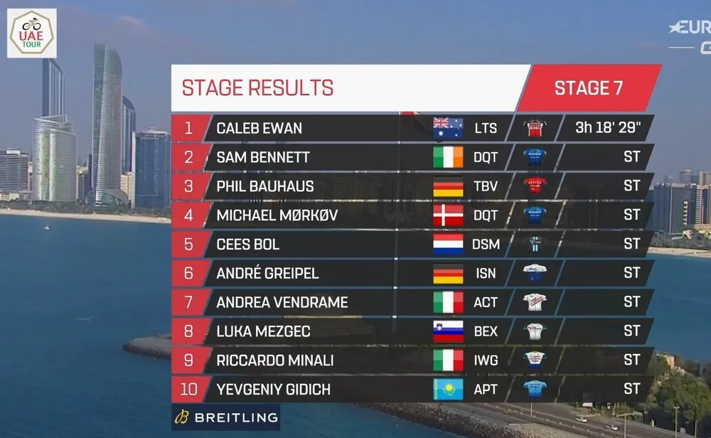 Au terme d’une arrivée au sprint lors de la 7e étape de l’UAE Tour, Caleb Ewan remonte devant Sam Bennett dans les derniers mètres et prive l’Irlandais d’un troisième succès dans ce tour. Le coureur de la formation Lotto Soudal remporte l’ultime étape de l’UAE Tour à Abu Dhabi. Il décroche un succès dans ce tour tout comme l’année dernière où il s’était offert la 2e étape de l’UAE Tour qui n’avait pas pu aller à son terme suite à l’émergence du Covid-19 et aux premiers cas.