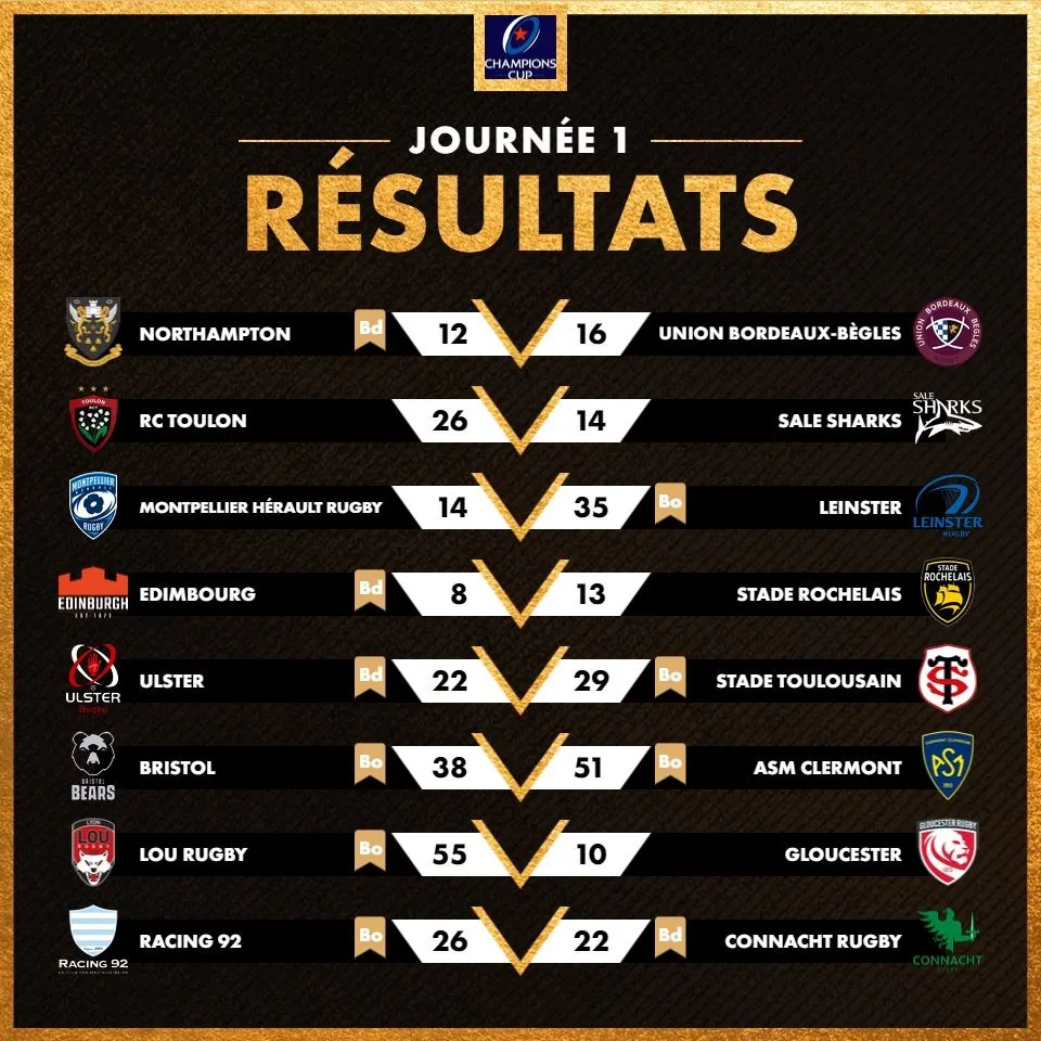 Les résultats de la première journée de Champions Cup :