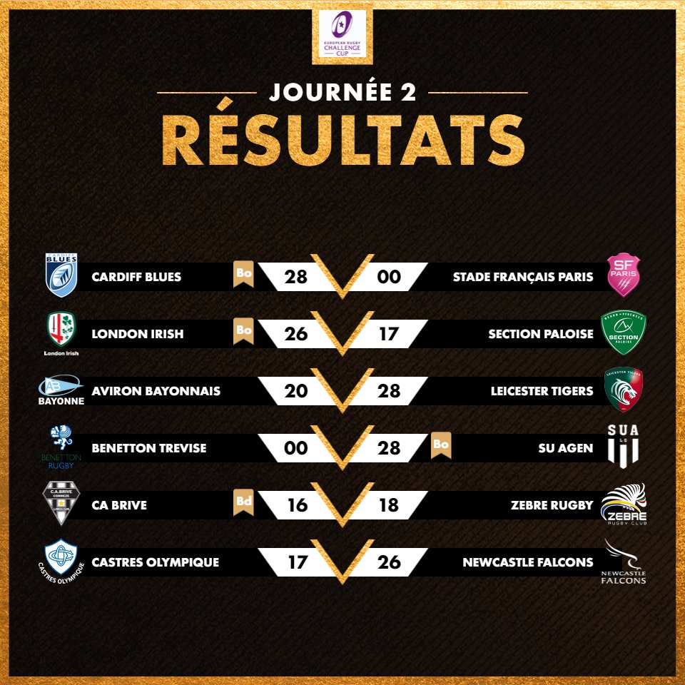 Pour le reste, Castres, Brive et Bayonne à domicile, Pau à l'extérieur et le Stade Français sur tapis vert (là aussi avec quelques zones d'ombre sur la gestion de la tenue de la rencontre) repartent avec 0 points, et donnent encore plus de grain à moudre aux détracteurs de la “petite” coupe d'Europe, qui n'est clairement pas prise au sérieux par les clubs français qui y sont engagés…