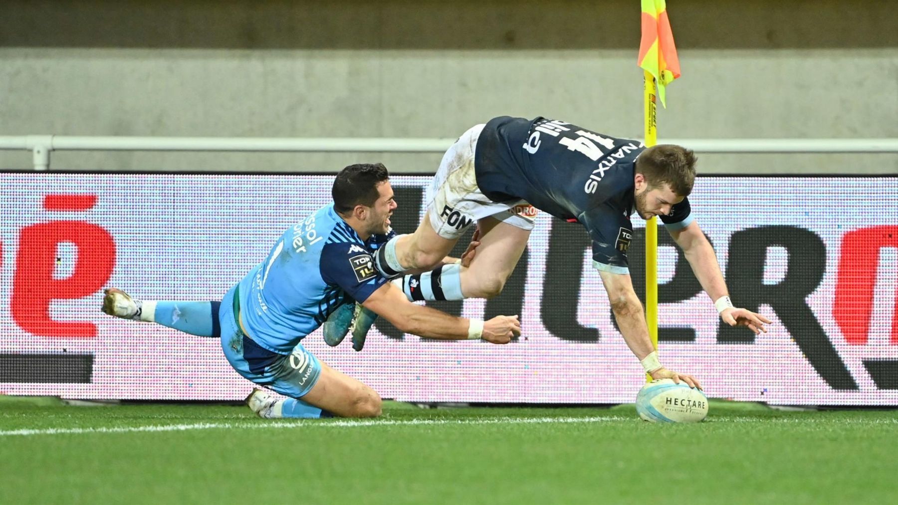 Ce dernier fixe le dernier défenseur et transmet à Lam, qui accélère pour passer la ligne des Jaunards, mais Nanai-Williams et Barraque arrivent à revenir à sa hauteur, le poussant à tenter une dernière passe vers Dubié, venu à son soutien. Il casse alors le plaquage de Lopez et s'en va marquer sous les poteaux pour conclure un essai incroyable de la part de son équipe !
