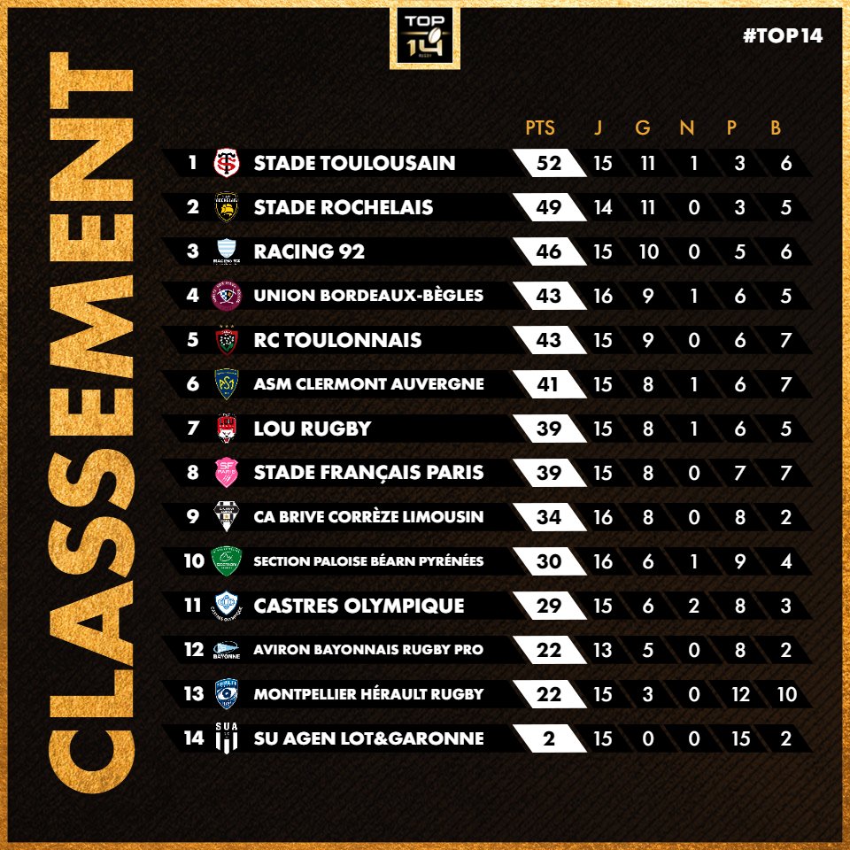 Le classement du Top 14 :