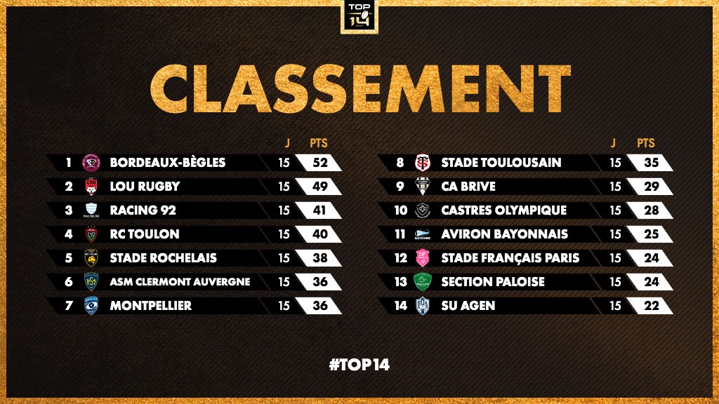 Bonne semaine à toutes et à tous qui nous suivez ? pic.twitter.com/HMKC0zeItU— TOP 14 Rugby (@top14rugby) February 17, 2020