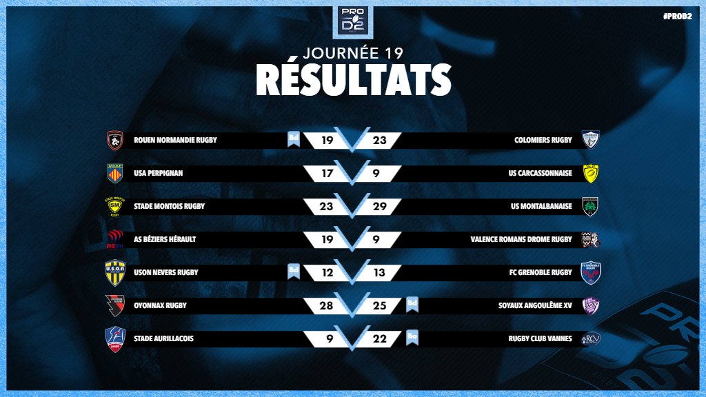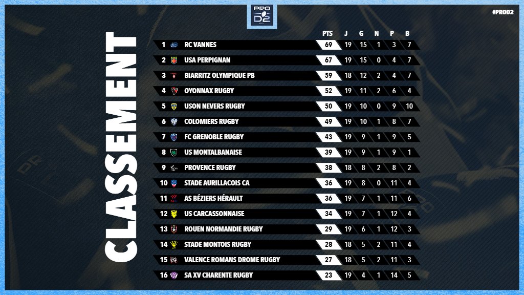 Derrière, c'est une course échevelée pour une qualification aux phases finales de cette Pro D2, qui restera certainement indécise jusqu'au bout ! Oyonnax, et Colomiers vainqueurs gardent leurs positions respectives, mais voient un boulet de canon grenoblois revenir à toute vitesse sur eux !