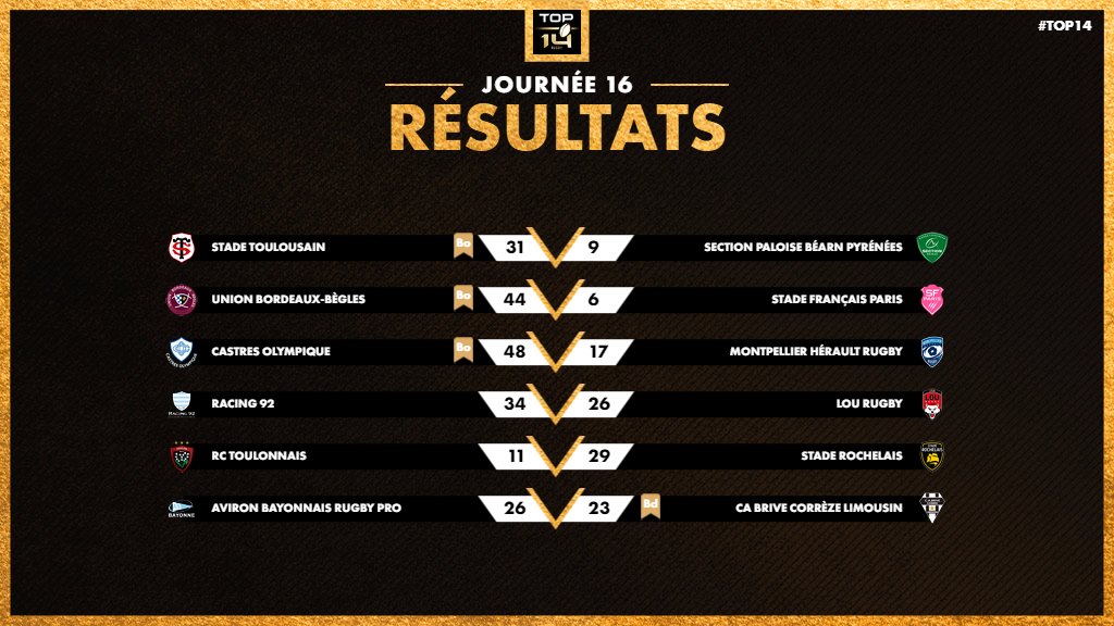 Après un week-end dernier consacré au rattrapage de matchs en retard, place à la 16ème journée de ce Top 14 en période de doublons, l'éternel problème des clubs de ce championnat. Mais pas ou peu d'incidence pour les quatre premiers du classement, qui ont tous suivi le même chemin, à savoir celui de la victoire. Seule contre-performance, le RC Toulon, qui a vu sa série impressionnante de 21 victoires à domicile s'arrêter face à une très solide équipe de La Rochelle. En bas, Bayonne recolle à Montpellier grâce à sa victoire acquise à l'arrachée face à Brive, pendant que les Héraultais s'écroulaient à Castres avec un Benjamin Urdapilleta record !