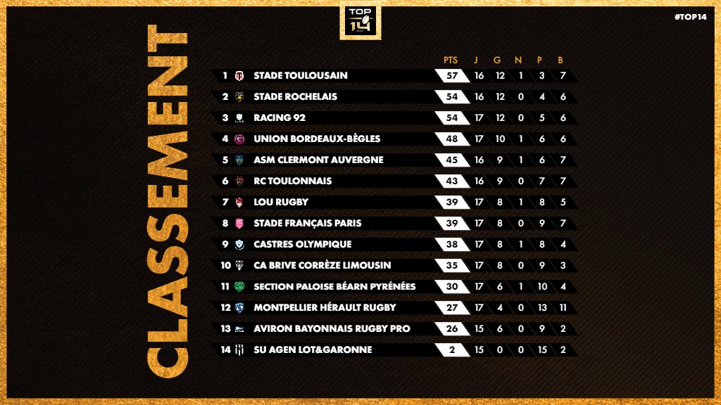 Autant dire que la bagarre sera rude entre ces deux équipes, mais aussi Pau, qui ne se trouve qu'à 4 points de leurs ennemis de toujours bayonnais…