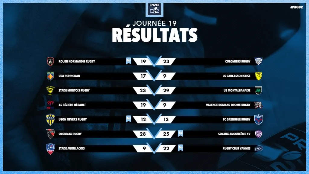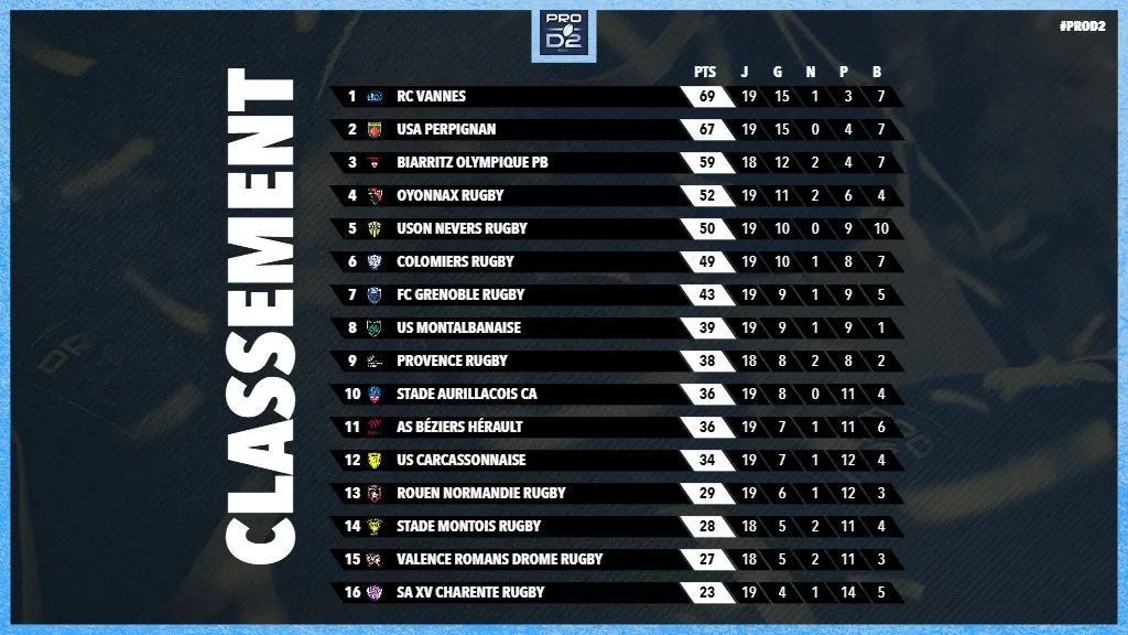 Derrière, c’est une course échevelée pour une qualification aux phases finales de cette Pro D2, qui restera certainement indécise jusqu’au bout ! Oyonnax, et Colomiers vainqueurs gardent leurs positions respectives, mais voient un boulet de canon grenoblois revenir à toute vitesse sur eux !