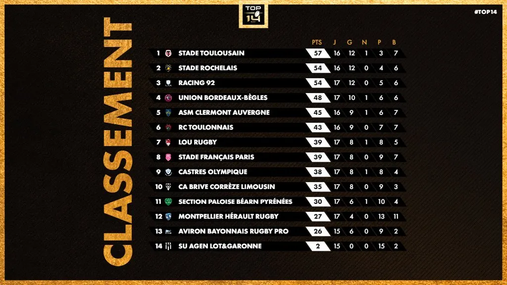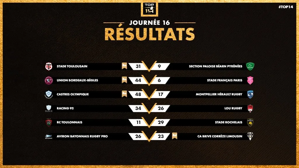 Après un week-end dernier consacré au rattrapage de matchs en retard, place à la 16ème journée de ce Top 14 en période de doublons, l’éternel problème des clubs de ce championnat. Mais pas ou peu d’incidence pour les quatre premiers du classement, qui ont tous suivi le même chemin, à savoir celui de la victoire. Seule contre-performance, le RC Toulon, qui a vu sa série impressionnante de 21 victoires à domicile s’arrêter face à une très solide équipe de La Rochelle. En bas, Bayonne recolle à Montpellier grâce à sa victoire acquise à l’arrachée face à Brive, pendant que les Héraultais s’écroulaient à Castres avec un Benjamin Urdapilleta record !