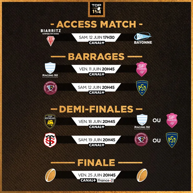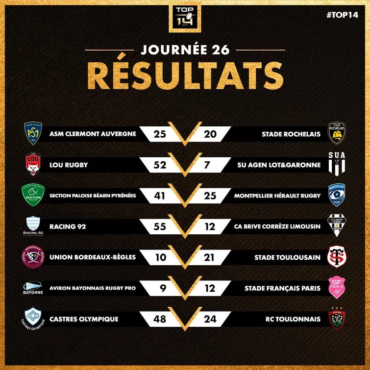 Organisée en multiplex, la dernière journée de Top 14 a livré toutes ses promesses. Ce week-end, le Stade français et Clermont ont confirmé leur place dans le top 6, la Section paloise a assuré son maintien dans l’élite tandis que l’Aviron bayonnais devra jouer l’access match face à Biarritz.