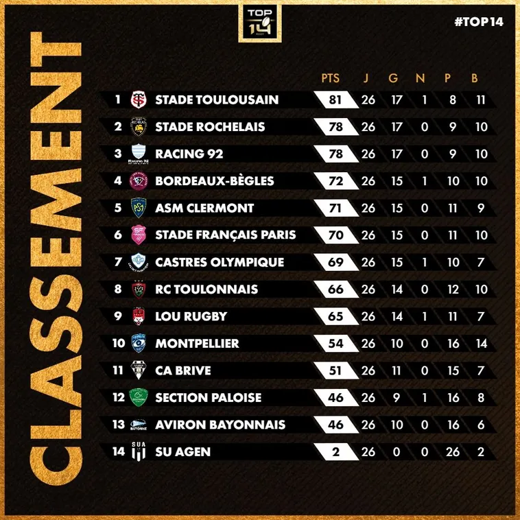 Malgré la défaite, le Stade rochelais peut avoir le sourire. Grâce à une pénalité inscrite par Jules Le Bail, à la 78e minute, les Maritimes ont décroché le point de bonus défensif. Résultat, les hommes de Jono Gibbes ont récupéré la deuxième place du championnat. Les coéquipiers de Grégory Alldritt pourront préparer dans des conditions idéales leur demi-finale.