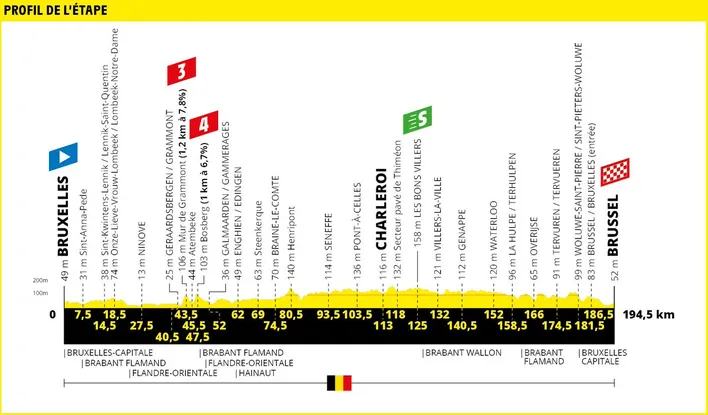 Ensuite, l’étape sera marquée par un petit clin d’œil aux classiques Flandriennes avec un passage sur le Mur de Grammont, classé en 3e catégorie, le célèbre mont long de 1200m à 7,8% avec ses pavés et le Bosberg – 1000m à 5,7 %, également avec des pavés. Ce dernier sera classé en 4e catégorie.