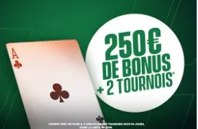 - Bonus de bienvenue poker : 250 € offerts + 2 tickets tournois