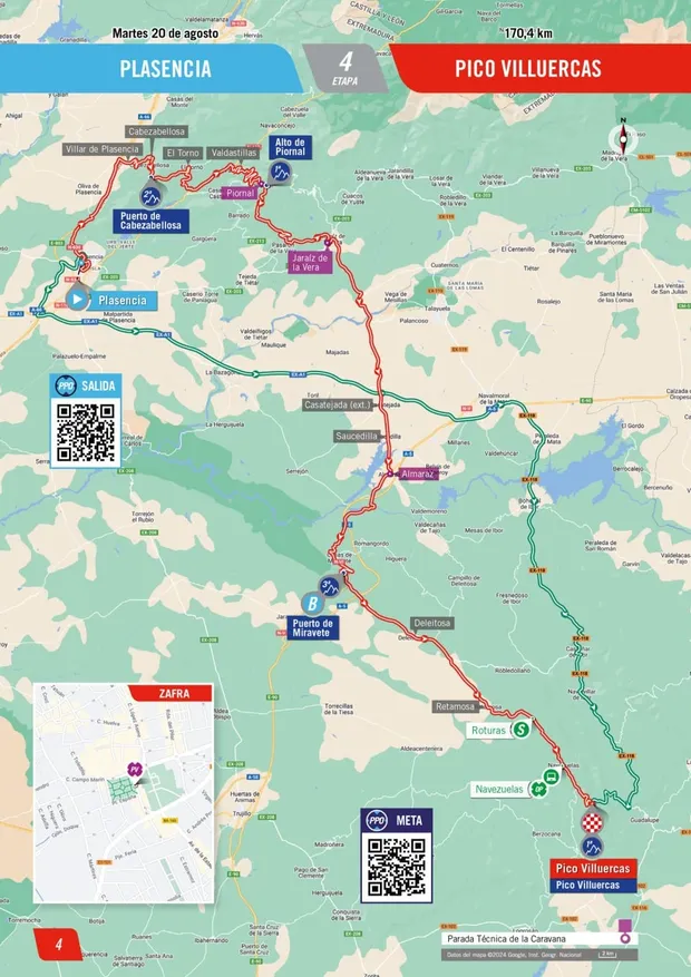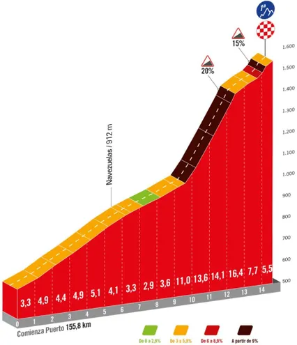 Première étape de montagne et première arrivée au sommet sur cette 79ᵉ édition de la Vuelta. La dernière ascension et juge de paix de ce mardi sera le Pico Villuercas. Une montée de 14,6 kilomètres à 6,2 % de pente moyenne qui se découpe en deux parties avec des passages à plus de 20% dans le final. Les 4 derniers kilomètres seront très compliqués. Avant ça le peloton devra passer l’Alto de Piornal classé en première catégorie. Une ascension de 13,9 kilomètres à 5,6% de moyenne montant à 776 mètres d’altitude avec des passages à 11% pour débuter la seconde partie de l’ascension.