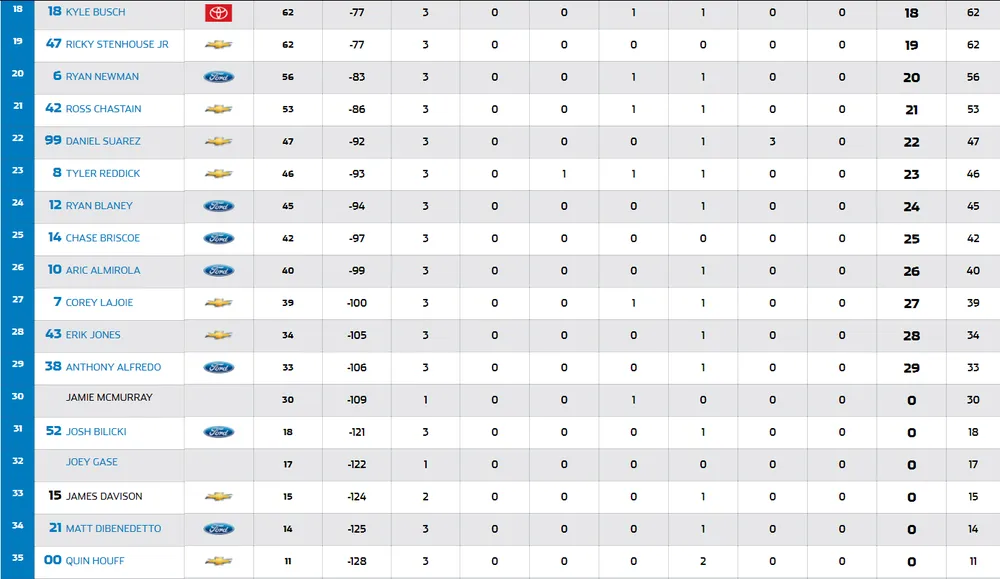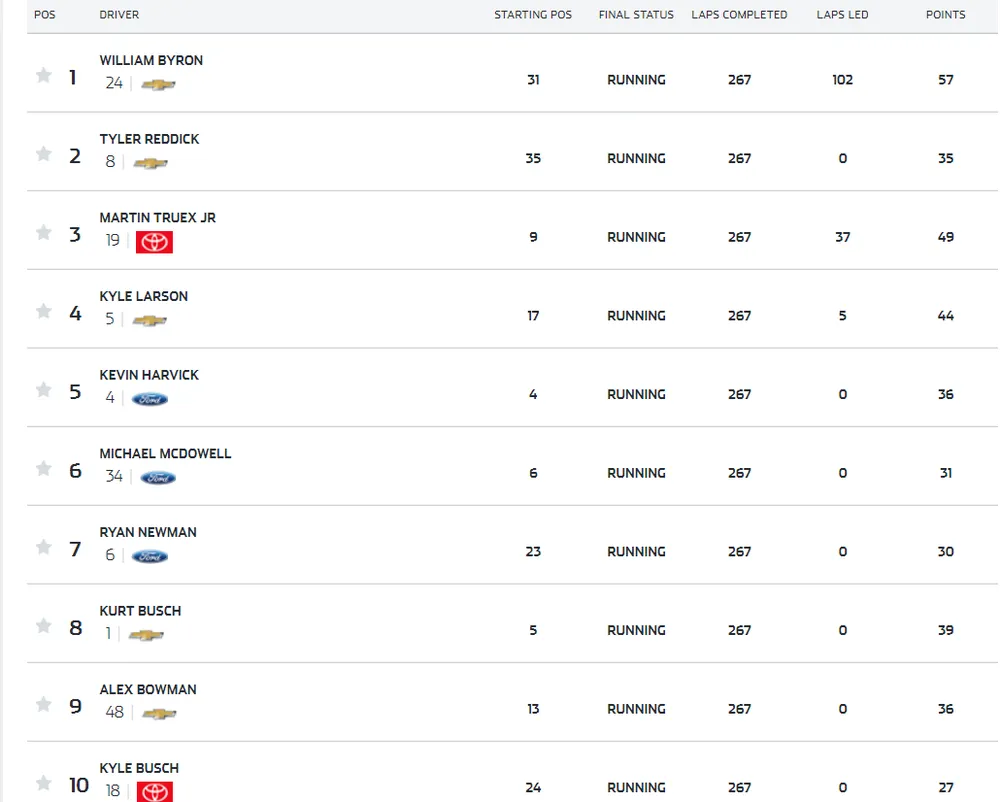 William Byron s’est élancé 31e au départ de ce Dixie Vodka 400, bien loin de croire que lui et sa voiture 24, mythique pour avoir été celle de Jeff Gordon il y a de cela encore quelques années, allaient remporter cette épreuve. Dans une course avec 6 interruptions, le jeune pilote qui n’est âgé que de 23 ans, n’avait jusqu’ici seulement décroché qu’une pole sur le mythique Daytona 500 dans sa saison rookie, avant d’être nommé Rookie de l’année. Il s’offre une remontée éclair d’une quinzaine de places en 10 tours avant d’être sagement calé dans le milieu du paquet. Il profite ensuite d’une première interruption au 26e tour et des stratégies décalées pour gagner petit à petit des places et terminer le premier secteur au quatrième rang. Toujours aux aguets, il reste calme dans les débuts de secteurs, alors que la course s’agite en fin de deuxième secteur, il prend la tête suite à un excellent pit stop au tour 156 puis 160 pour se lancer dans un run formidable où seul un arrêt au box lui fera perdre temporairement la tête avant de s’imposer seul avec presque 3 secondes d’avance sur un autre pilote ayant remonté tout le peloton : Tyler Reddick parti 35e. C’est donc la première victoire de la carrière de William Byron.