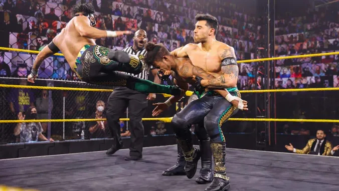 Wes Lee et Nash Carter défendaient leur titre de champion par équipe contre Legado del Fantasma (Joaquin Wilde et Raul Mendoza). Au début du show, un petit clip tourné en amont nous apprend que Santos Escobar sera présent aux abords du ring pour accompagner Legado del Fantasma. L’ancien champion Cruiserweight a tenté d’intervenir en bousculant Wes Lee dans l’escalier. Malgré ça, MSK ne faiblit pas. Bronson Reed intervient et fonce sur Escobar, le projetant dans les barrières. MSK fait son Neck Breaker à deux sur Mendoza pour le compte de trois. Le champion nord-américain et les champions par équipe célèbrent pour conclure le show.