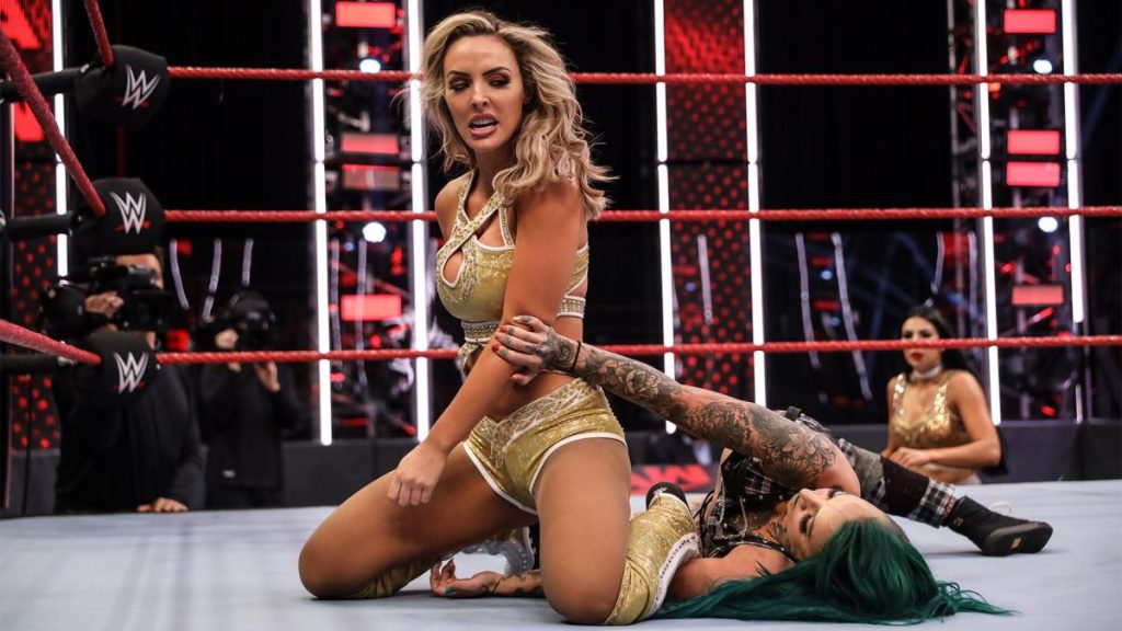 Ce combat oppose Ruby Riott à Peyton Royce accompagnée par Billie Kay. Royce n’aura pas besoin de l’aide de son amie puisqu’elle remporte le compte de 3 grâce à un Spinning Brain Buster. Il est temps que Ruby Riott revienne au meilleur de sa forme…