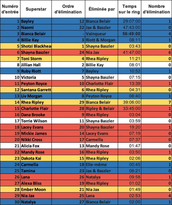 Entrée en troisième position, Bianca Belair a su tenir 57 minutes et a éliminé quatre personnes. En fin de bataille, elle était face à Rhea Ripley, les deux femmes méritaient de remporter cette rencontre, mais The EST a su s’imposer. Pendant le combat, alors que Alicia Fox faisait son entrée, R-Truth est arrivé, Fox lui a pris son titre 24/7, mais Truth la récupéré quelques temps après. Un moment peu intéressant qui n’avait pas lieu d’être. Alexa Bliss, qui était une des favorites, n’est restée qu’à peine une minute. Pendant cette bataille, nous avons eu des noms surprises comme Jillian Hall, Victoria, ou encore Torrie Wilson. Voici la liste des superstars féminines présentes :
