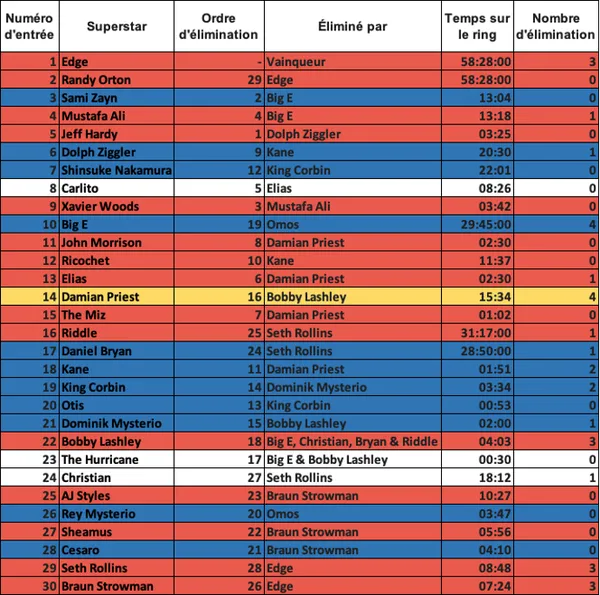 Arrivé le premier, Edge a su résister 58 minutes et remporter son ticket pour Wrestlemania. En fin de bataille, il s’est retrouvé face à Seth Rollins qui a fait son retour en entrant en 29ème position. Edge élimine ce dernier, mais c’était sans compter sur Randy Orton, qui, entré en seconde position avait simulé une blessure à la jambe en début de match et avait été évacué. Orton est finalement revenu après que Rollins se soit fait éliminer, mais Edge parvient à le contrer et l’élimine pour remporter le deuxième Royal Rumble de sa carrière. Pendant le combat, son ami Christian est venu l’aider, un moment vif en émotion. Nous avons eu aussi deux autres noms surprises, Carlito et The Hurricane. Étonnamment, il n’y a eu qu’une seule superstar de NXT. Voici la liste des superstars masculines présentes :