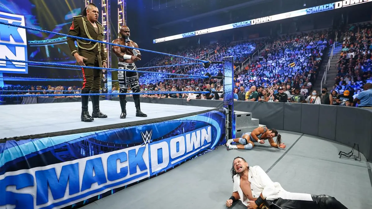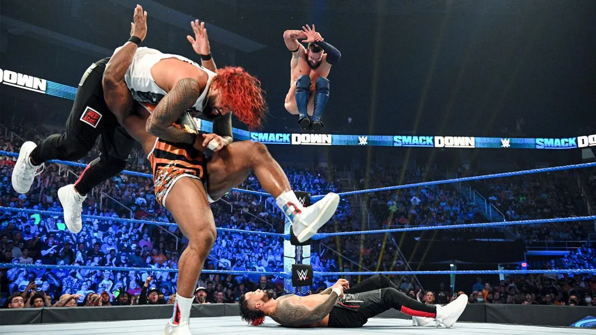 Hier soir, SmackDown a commencé très fort. La Bloodline était comme souvent sur le ring pour ouvrir le show. Et alors que Paul Heyman parlait de Brock Lesnar, la musique du nouveau champion de la WWE s’est fait entendre. Big E était donc de retour à SmackDown, quelques jours après avoir battu Lashley pour le titre. L’ancien Mr. Money in the Bank n’est pas rester seul bien longtemps, rejoint par Finn Balor, qui affrontera Reigns à Extreme Rules. Après une courte pub, Les Usos étaient opposés à Finn et Big E. Et malheureusement pour les cousins, les liens du sang n’auront pas suffit. Finn gagner du momentum à 8 jours de Extreme Rules, tandis que Big E continue sa semaine de rêve.